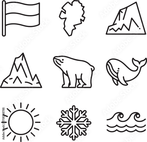 Hand-Drawn Greenland Nature and Culture Icons Pack Flag, Map, Iceberg, Polar Bear, Whale, Sun Disk, Snowflake, and Arctic Heritage Symbols