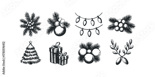 Hand-drawn holiday icons featuring Christmas tree, presents, and ornaments