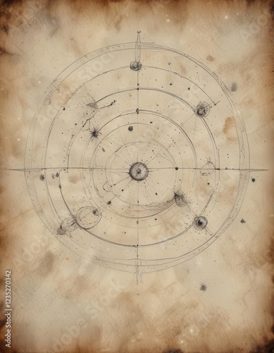 Hand-drawn illustration of a classic constellation on antique paper with subtle texture, featuring twinkling stars and planets , vintage, celestial