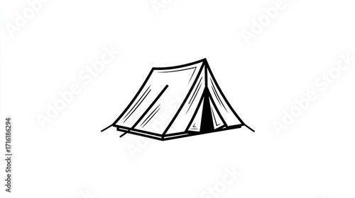 Hand-drawn illustration of a simple A-frame tent, showing a slightly open flap, resting on the ground with lightly sketched lines indicating the base