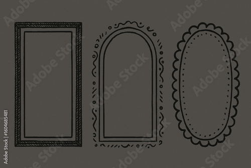 Hand-drawn illustration of three empty frames, one rectangular with a dotted border, one arched with wavy lines, and one oval with a scalloped edge, on a dark gray background.