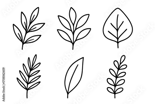 Hand-drawn minimalist botanical leaves set. Collection of simple black and white line art floral elements. Vector illustration of organic plant, branch, and twig doodles.