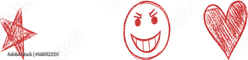 Hand-drawn red star, angry emoticon, and heart sketches on a white background, representing various emotions.