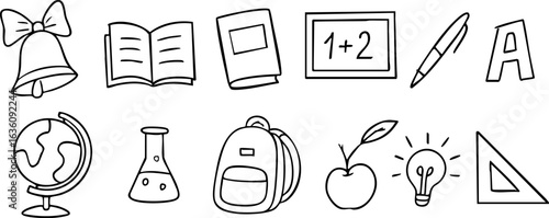 Hand-drawn school icons including bell, books, backpack, apple, globe, and more. Ideal for educational projects, kids’ designs, and back-to-school themes