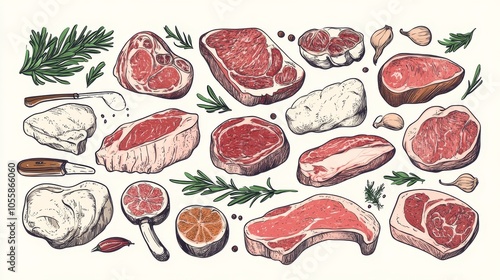 Hand-drawn set of meat doodles, perfect for restaurant or butcher designs.