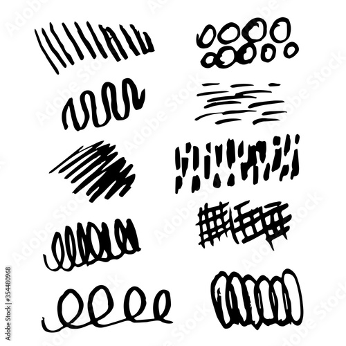 Hand-drawn simple vector set. Sketch, doodle, curls, zigzag, strokes, stripes for creating patterns, design. Black outline on a white background.