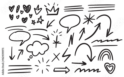 Hand-drawn sketch elements: hearts, arrows, speech bubbles, stars, crown