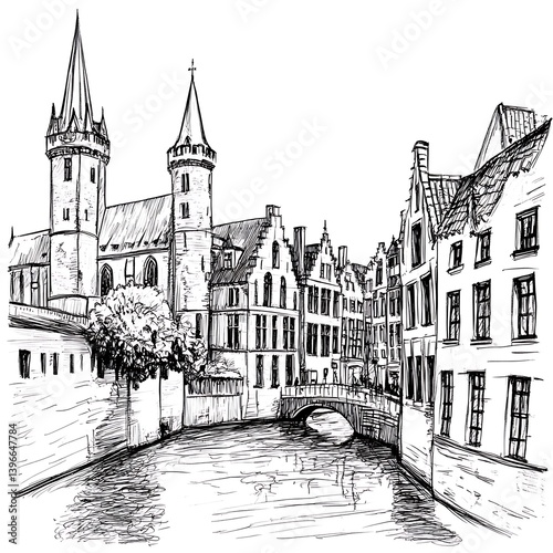 Hand-drawn sketch of a charming European canal-side town with medieval architecture and a bridge.