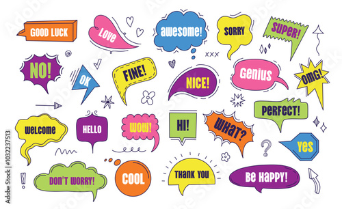 Hand-drawn speech bubbles. Cartoon comic message frames with text, cute doodle speech cloud and thought shape. Vector set