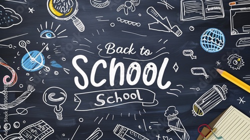 Hand-drawn style illustration of the text "Back to school" with a chalkboard background and various doodles related to school subjects