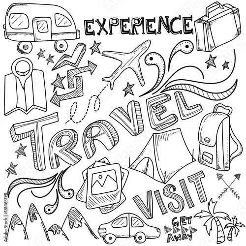 Handdrawn symbols of tourism and traveling.