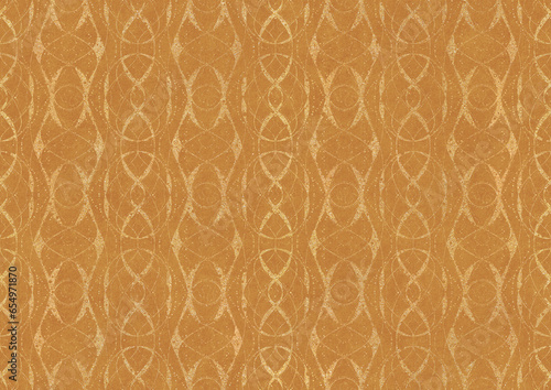 Hand-drawn unique abstract symmetrical seamless gold ornament on a yellow background. Paper texture. Digital artwork, A4. (pattern: p10-4c)