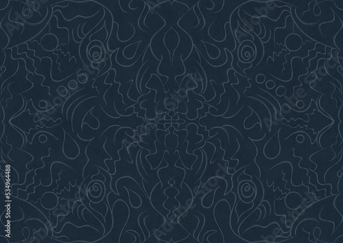 Hand-drawn unique abstract symmetrical seamless ornament. Light blue on a deep blue background. Paper texture. Digital artwork, A4. (pattern: p07-1a)