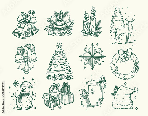 Hand-Drawn Vintage Christmas Icon Set in Sketch Style, Featuring Bells, Wreath, Snowman, Tree, and More