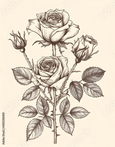 Hand-Drawn Vintage Roses with Buds in Classic Artistic Style