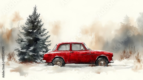 Hand-Drawn Watercolor Retro Car with Fir Tree Holiday Illustration