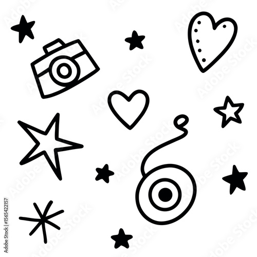 Hand-drawn whimsical doodle pattern: hearts, stars, camera, yo-yo.