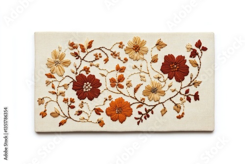Hand-embroidered floral artwork on beige fabric, featuring orange and beige flowers and leaves.
