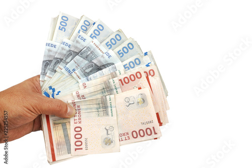 Handful Danish krone. ( DKK ) 500 and 1000 Krone banknotes .