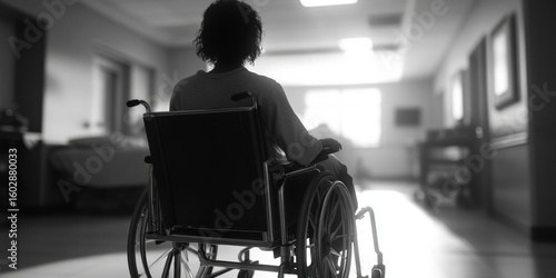 Handicapped woman in wheelchair waiting patiently. Healthcare facility with medical staff assistance.