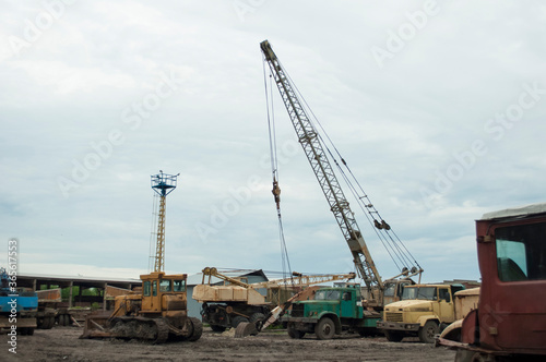 Handicraft brick factory, parking of old rusty tractors, trucks