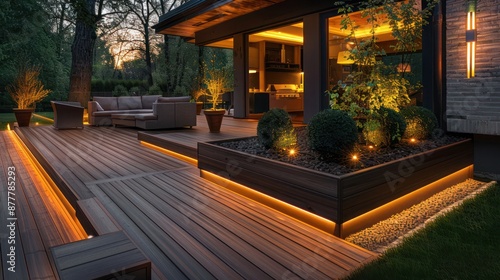 hand-laid wooden Craftsman-style deck, featuring built-in lighting and planters for an elegant outdoor living space