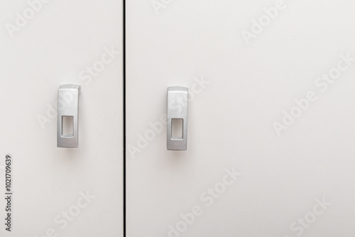 Handles on white wooden swing cabinet. Furniture fittings. Small silver furniture handles