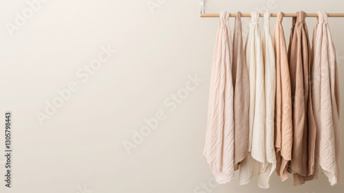 Handmade clothing collection displayed on wooden rack in neutral tones for modern home decor