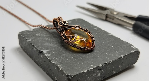 Handmade Copper Pendant with Amber Stone A Detailed Close-Up of Craftsmanship