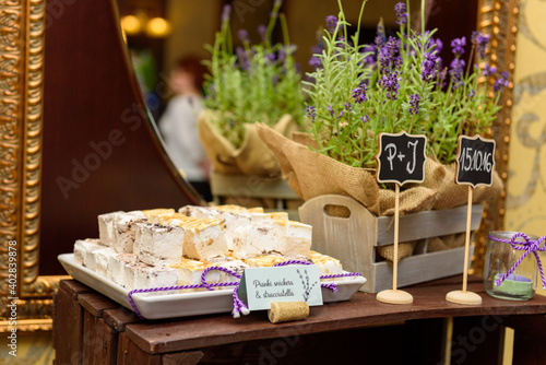 Handmade marshmallows on a rustic sweet table at the wedding party