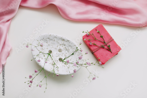 Handmade natural soap with ceramic dish, pink silver dress. Soap bars. Spa, skin care. Natural Organic spa cosmetic products