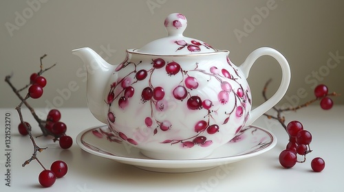 Hand-painted ceramic teapot and saucer with berries