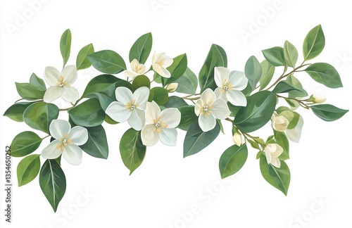 Hand-painted vector art illustration of white flowers and green leaves on a long branch. Spring season