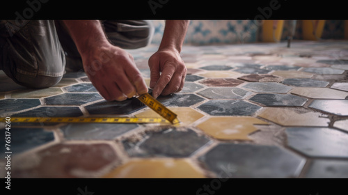 Hands are precisely measuring and laying patterned tiles on a floor.