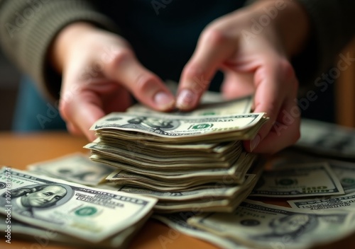 Hands arranging stacks of cash on a wooden table in a close-up view.