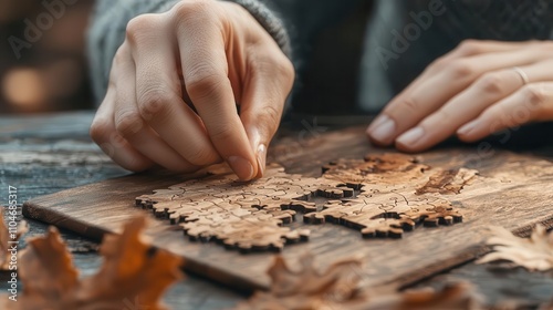 Hands assembling a handmade wooden puzzle, precision and care visible