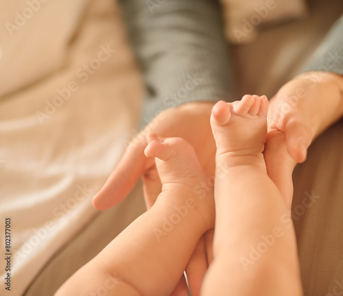 Hands, baby feet and home in bedroom, newborn and family for love, care and nurture. Bonding, support and childhood in person, infant and parent with tiny, toddler and connection, skin and develop