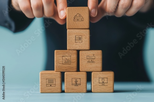 Hands Balancing Creative Arrangement of Wooden Blocks with Geometric Designs on Light Blue Surface