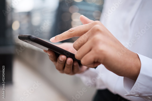 Hands, balcony or businesswoman in city with phone or online connection for text message or social media chat. Lawyer, outdoor or legal advisor typing on mobile app for news, schedule or notification