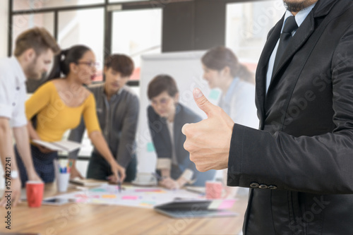Hand's boss businessman thump up with team meeting brainstorming blurred background. Business concept.