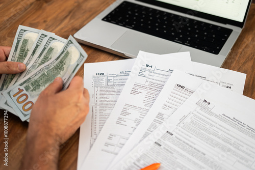 Hands counting hundred-dollar bills with tax forms and a laptop on a wooden table. Financial management and tax filing concept.