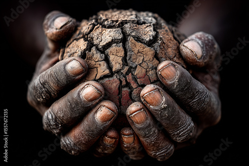 Hands cradling earth: A pair of weathered hands cupping a cracked earth, a poignant reminder of environmental degradation. The image evokes a sense of both fragility and resilience.