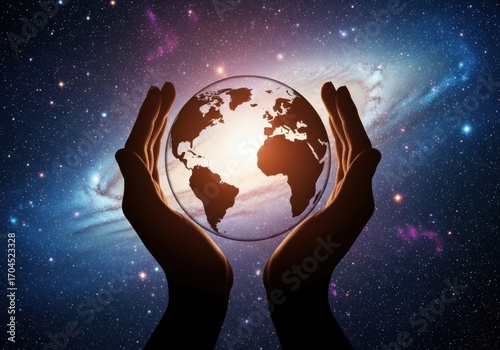Hands cradling glowing earth in starry cosmos holding globe