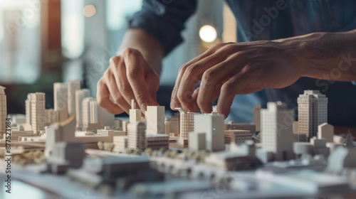 Hands delicately adjusting a miniature building model, highlighting the precision and creativity involved in urban planning and design.