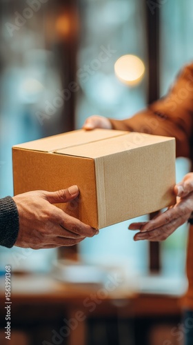 Hands exchanging a cardboard box in a modern interior setting with warm lighting and a casual atmosphere