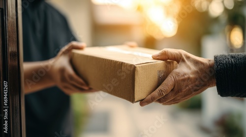 Hands Exchanging Cardboard Box Through Doorway