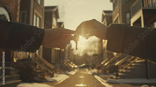 Hands Exchanging Keys In Residential Neighborhood During Sunset, Real Estate