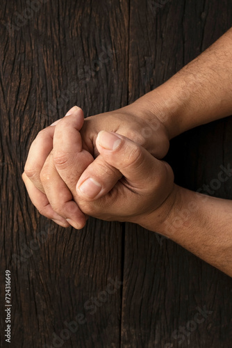 Hands folded together palms folded in prayer. Clasped fingers. sits and holds hands in front of hands clasped together. on a dark wood floor