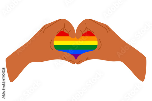 Hands forming heart shape with LGBTQ heart inside. Vector illustration.