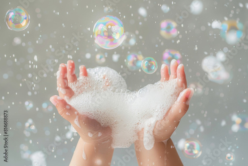 Hands gently cradling a soft pile of foam, surrounded by floating iridescent bubbles against a neutral blurred background, symbolizing purity and cleanliness on a serene blue backdrop